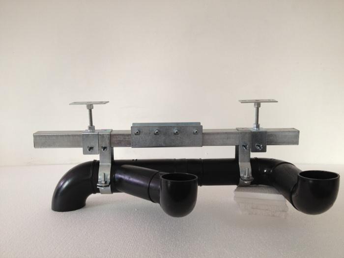 虹吸排水安装固定系统的主要功能是辅助安装与固定管道。虹吸式雨水管道系统的固定装置包括与管道平行的方形钢导轨,管道与方形钢导轨间的连接管卡(根据不同的管径,每隔0.8至1.6米布置管卡),用于固定钢导轨的吊架及镀锌角。