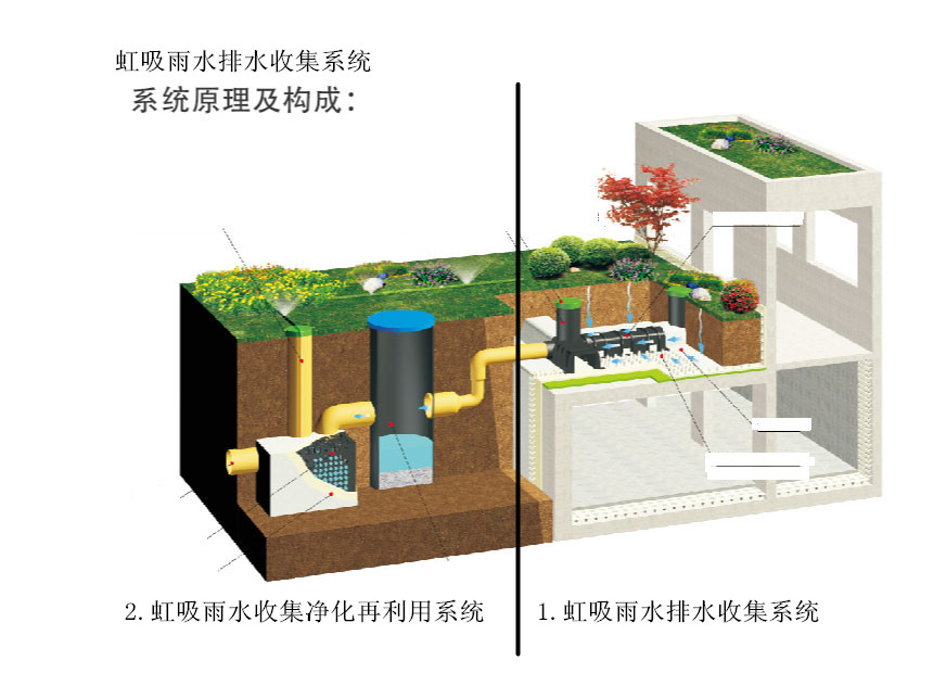 2.虹吸雨水收集净化系统是指雨水经过观察井的沉淀,流入蓄水模块,回收到地面进行灌溉。实现雨水的二次利用。