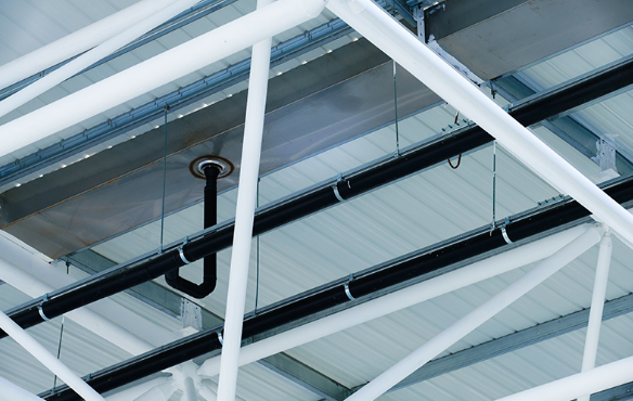 虹吸排水管道安装在吊顶内水平管道可贴楼板或梁安装而无需放坡,并且多个雨水斗连接于一个水平管内节约了宝贵的建筑空间。系统安装有以下要求:
